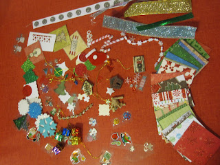 Then grab some pretty scrapbook paper for the holidays. I used my seemingly endless supply. While you are at it find yourself some embellishments. The possibilities are limitless! Old buttons, tiny decor presents, old gift tags you have been hanging onto forever and didn't know why, stickers etc. I also added in some ribbons.